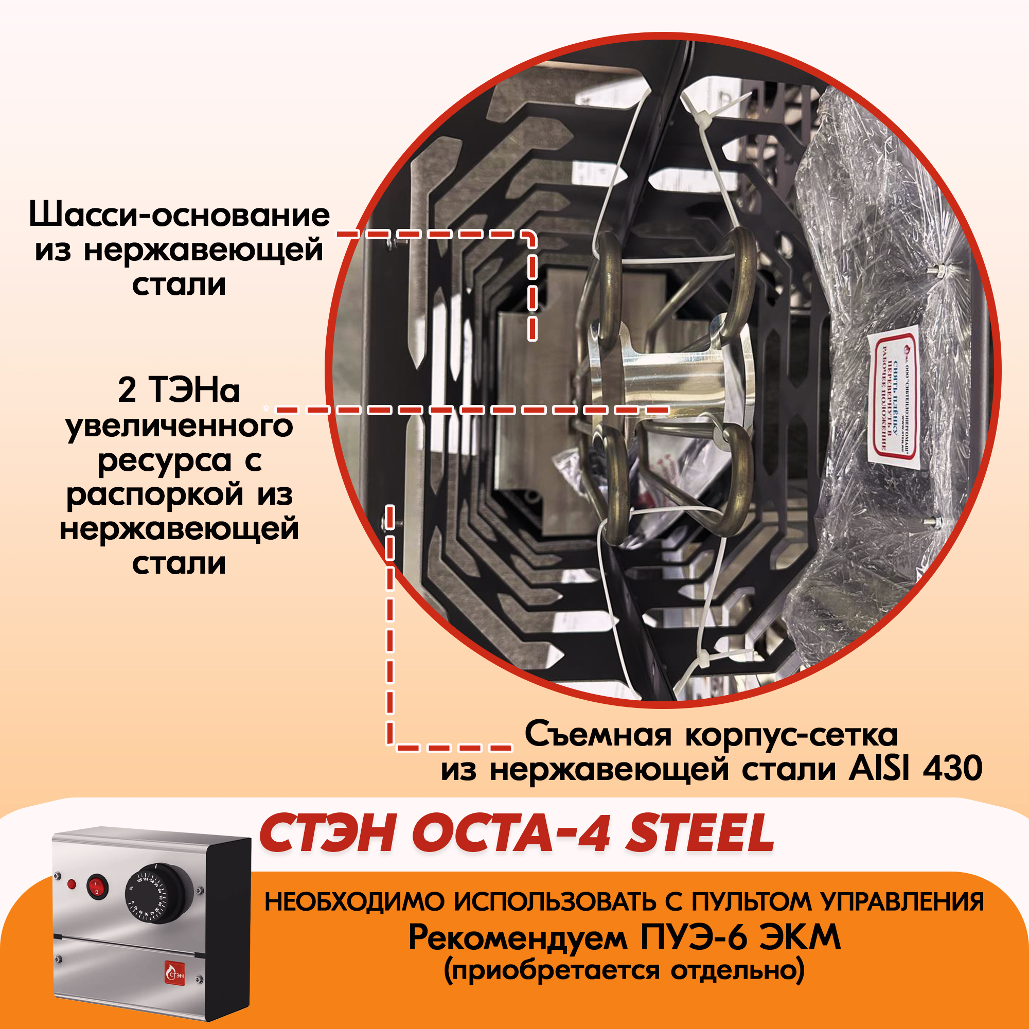 Съёмный корпус-сетка электрокаменки с индексом steel  изготовлен из нержавеющей стали AISI 430.